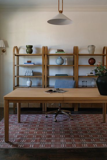 white oak modern desk, built ins, modern black light fixture, modern black pendant modern desk chair